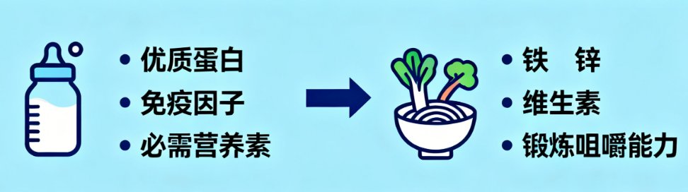 母乳(或配方奶)是 6 个月 - 1 岁宝宝最主要的营养来源,能提供优质蛋白、免疫因子和生长必需的营养素;而辅食的作用是补充母乳中不足的铁、锌、维生素等,同时锻炼宝宝的咀嚼、吞咽能力,为未来自主进食打基础。两者各司其职,缺一不可。就算断了母乳,宝宝依然需要通过配方奶、酸奶等奶制品获取营养,盲目断奶反而可能让宝宝陷入 “既不吃辅食,又没了母乳” 的营养真空,得不偿失。