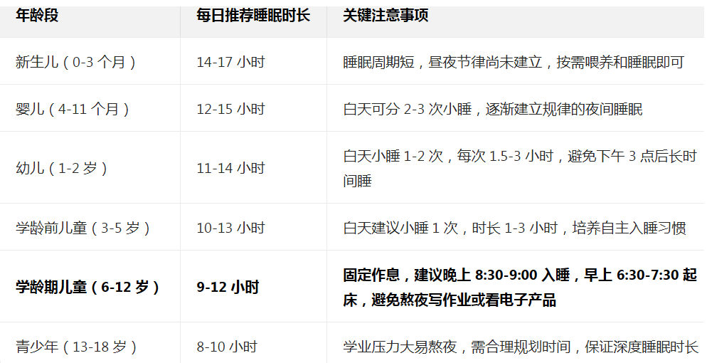 1. 保证“”分龄充足睡眠”,不同年龄段的孩子有对应的睡眠时长需求,别让娃熬夜;