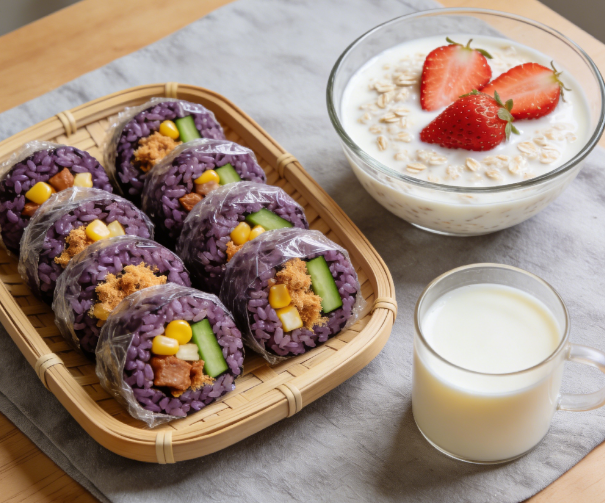 方案五:暖心紫米饭团。前一晚把紫米和糯米蒸熟放凉,早上取适量米饭,加入肉松、熟玉米丁、黄瓜条,捏成饭团;用微波炉高火加热30秒,配一杯酸奶和几颗草莓,营养均衡还便携。